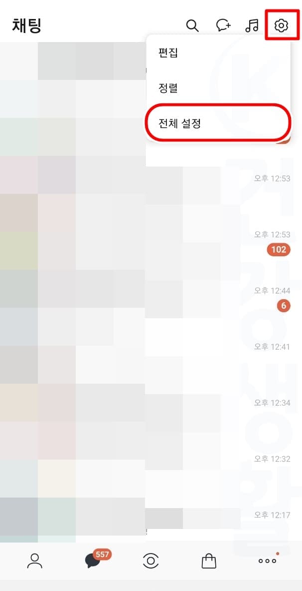 1. 카톡 앱에서 톱니바퀴 버튼 클릭 후 전체설정을 누릅니다.