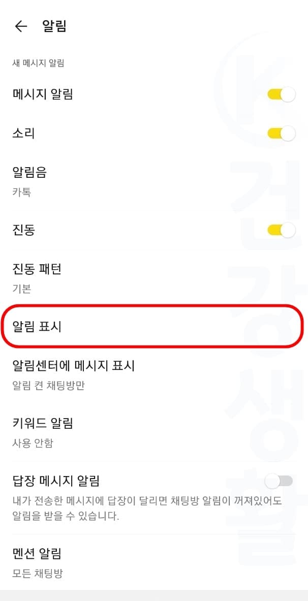 이렇게 설정을 하게 될 경우 나의 카카오톡 채팅방의 모든 메시지가 팝업 푸시, 상단바에서 알림되지 않습니다.