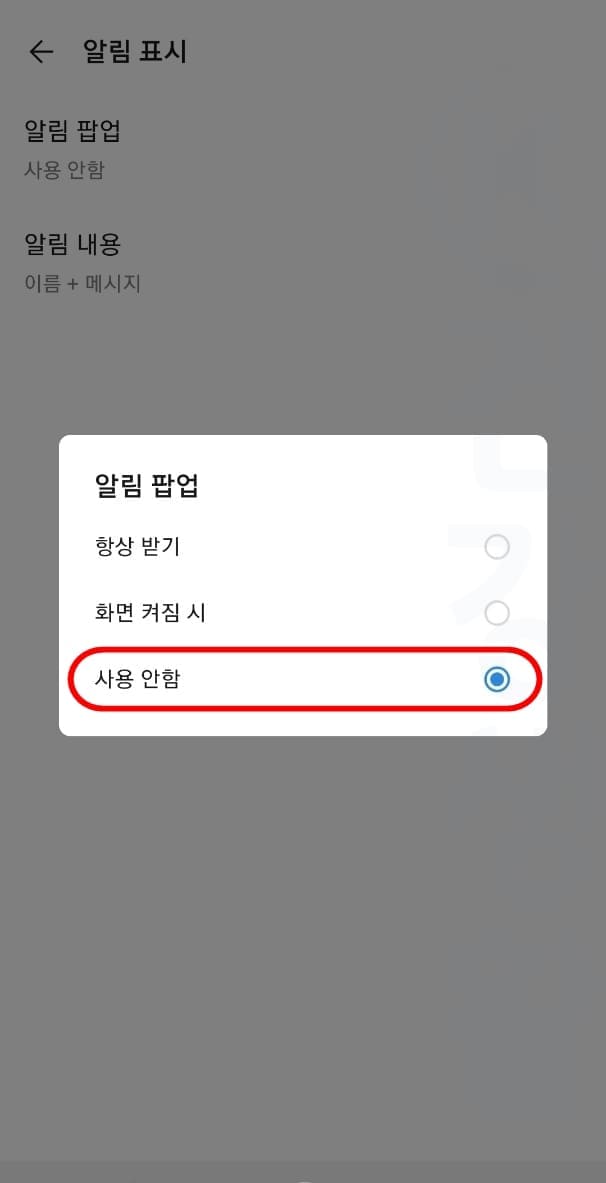 6. 알림 팝업을 사용 안함으로 설정합니다.