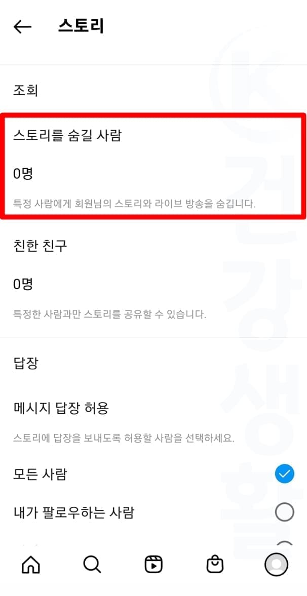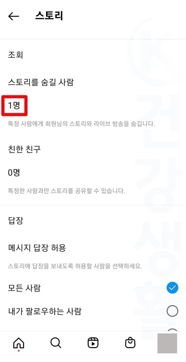 7. 선택한 특정인에게 내 스토리가 비공개됩니다.