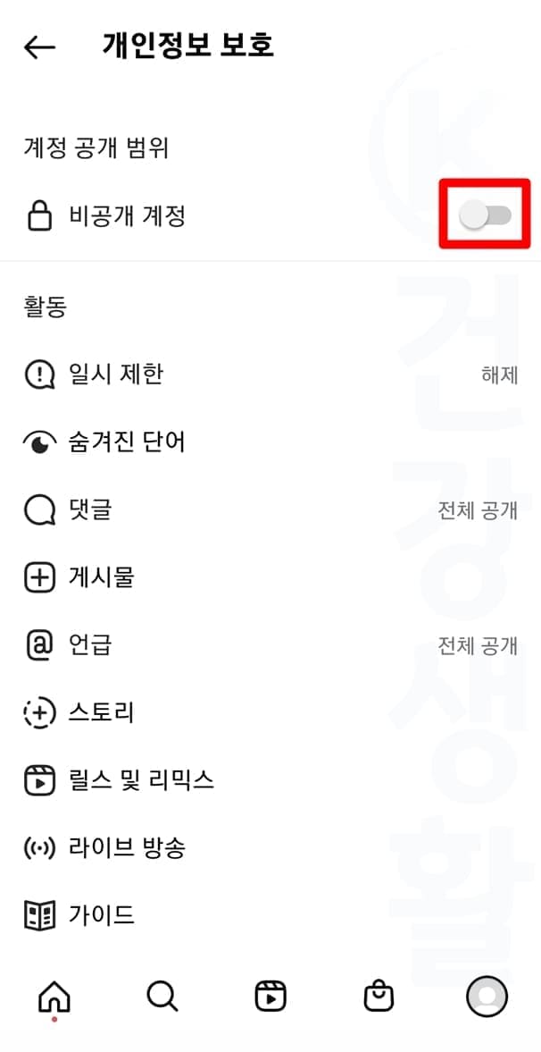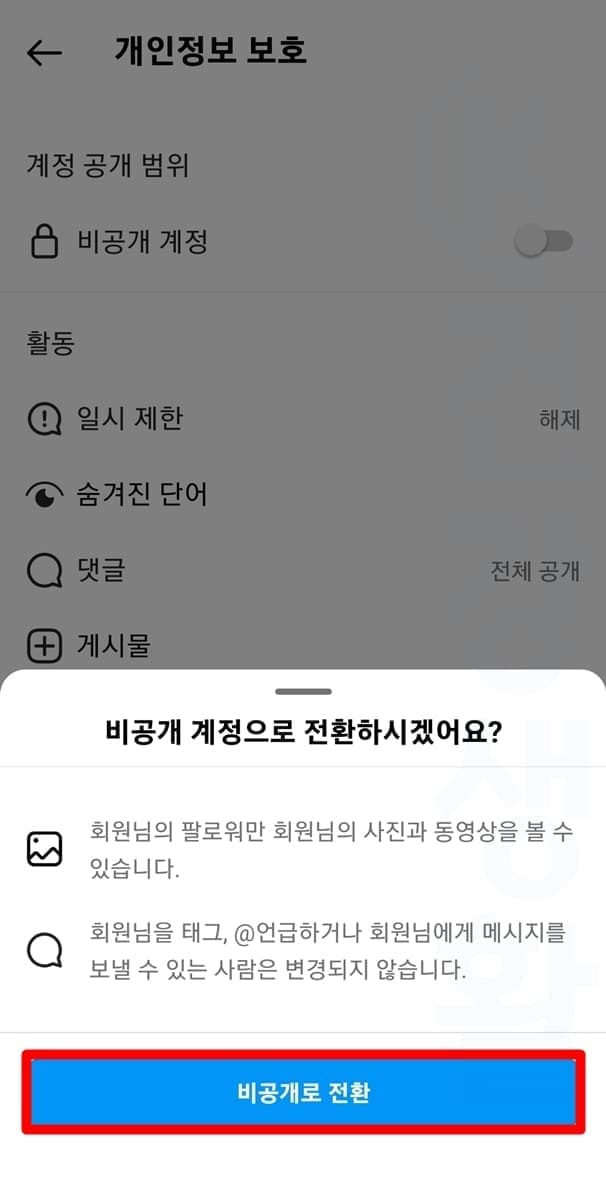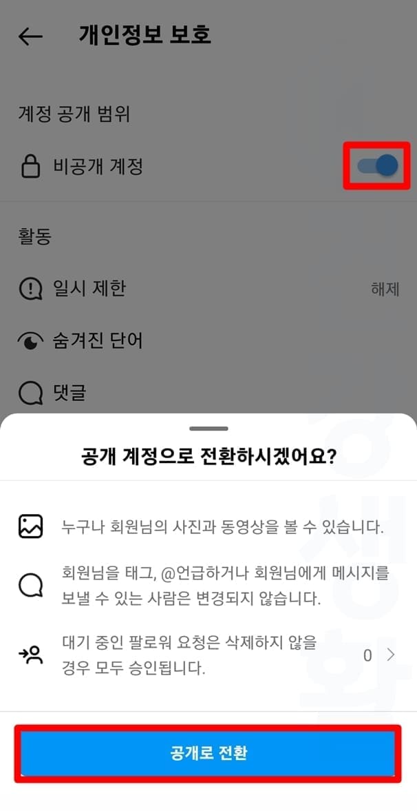 나중에 비공개 계정을 공개 계정으로 전환하고 싶다면 동일한 메뉴 위치에서 비공개 계정을 비활성화하시면 됩니다.