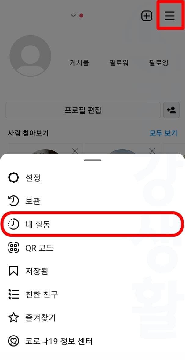 2. 더보기 메뉴 > 내 활동을 클릭합니다.