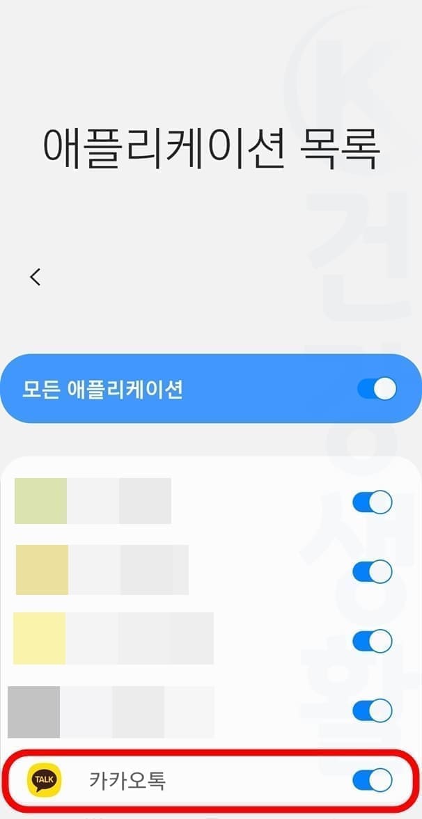 기본적으로 모든 애플리케이션이 켜져있는데 이것은 카카오톡 앱도 켜진 상태라고 생각하시면 됩니다. 이제 갤럭시 카톡 미리보기 설정이 모두 완료되었습니다. 곧바로 아래에서 확인해보도록 하겠습니다.