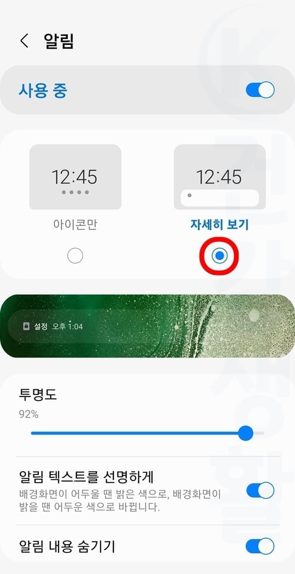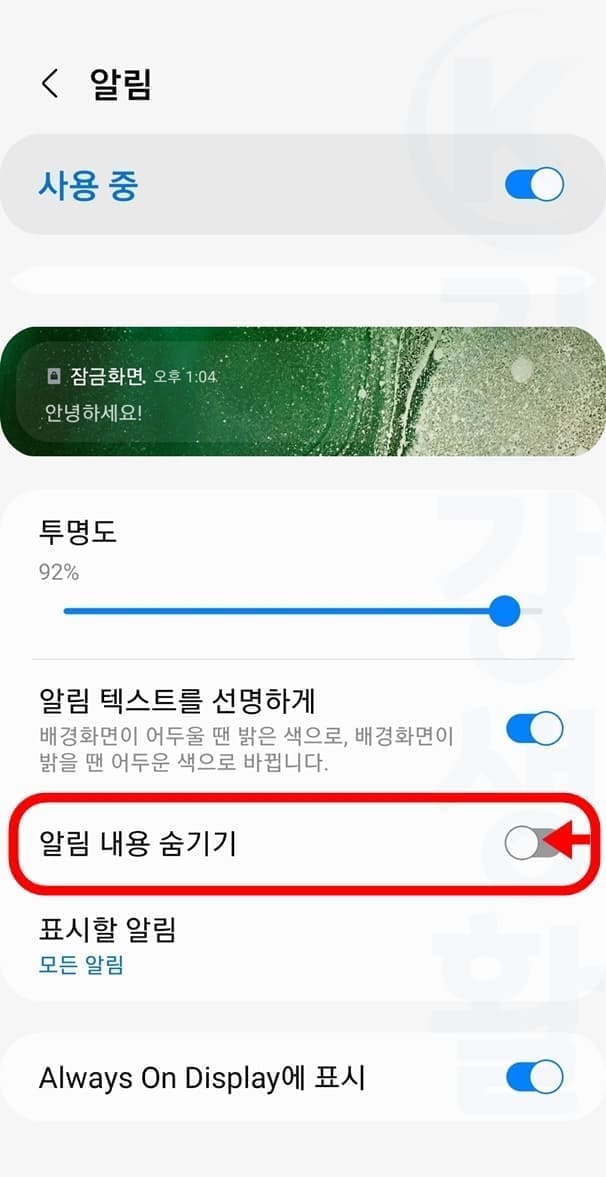 5. 알림 내용 숨기기 기능을 비활성화합니다.
