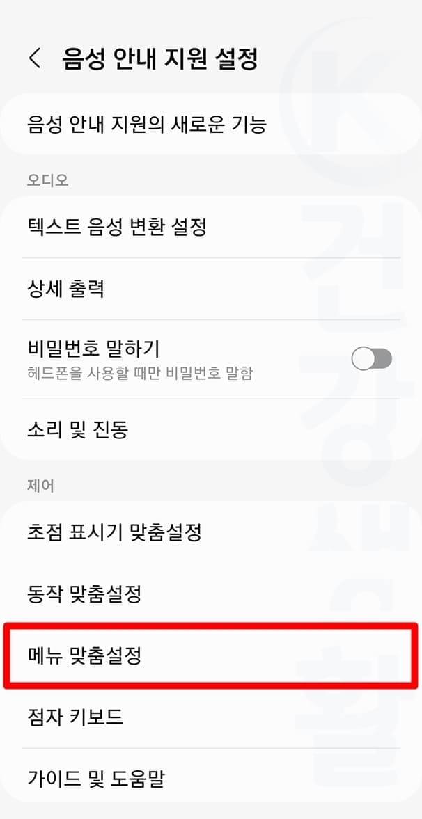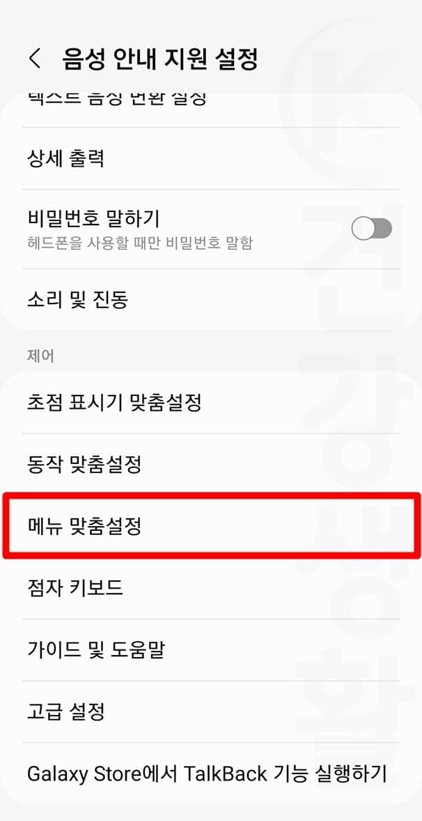 1. 토크백 음성 안내 지원 설정에서 메뉴 맞춤설정을 클릭합니다.