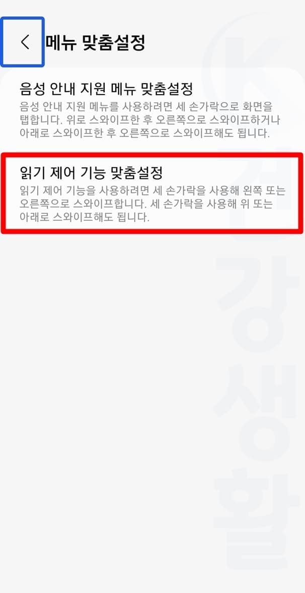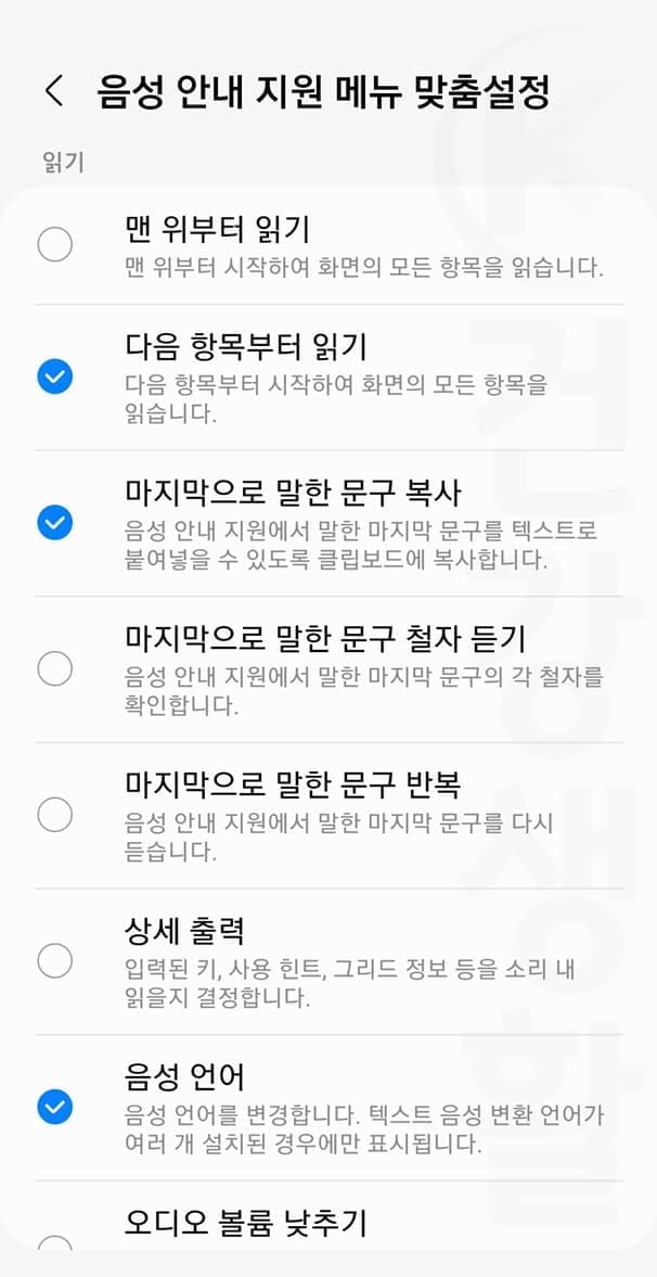 이곳에서 음성 안내 지원 메뉴 맞춤설정에 나오는 기능을 수정할 수 있습니다. 즉, 위의 삼성 TTS 사용법으로 알아본 세손가락 화면 터치시 나오는 메뉴 구성을 변경할 수 있습니다. 기능들에서는 맨 위부터 읽기, 다음 항목부터 읽기, 마지막으로 말한 문구 복사, 마지막으로 말한 문구 철자 듣기, 마지막으로 말한 문구 반복, 상세 출력, 음성 언어, 오디오 볼륨 조절 등이 있습니다. 여기서 '맨 위부터 읽기' 기능은 정말 편리하니 설정을 강력추천드립니다.