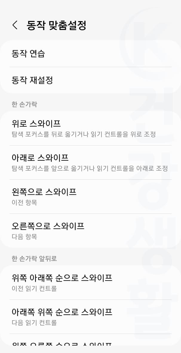 토크백 화면 > 설정 > 동작 맞춤설정을 클릭해주세요.