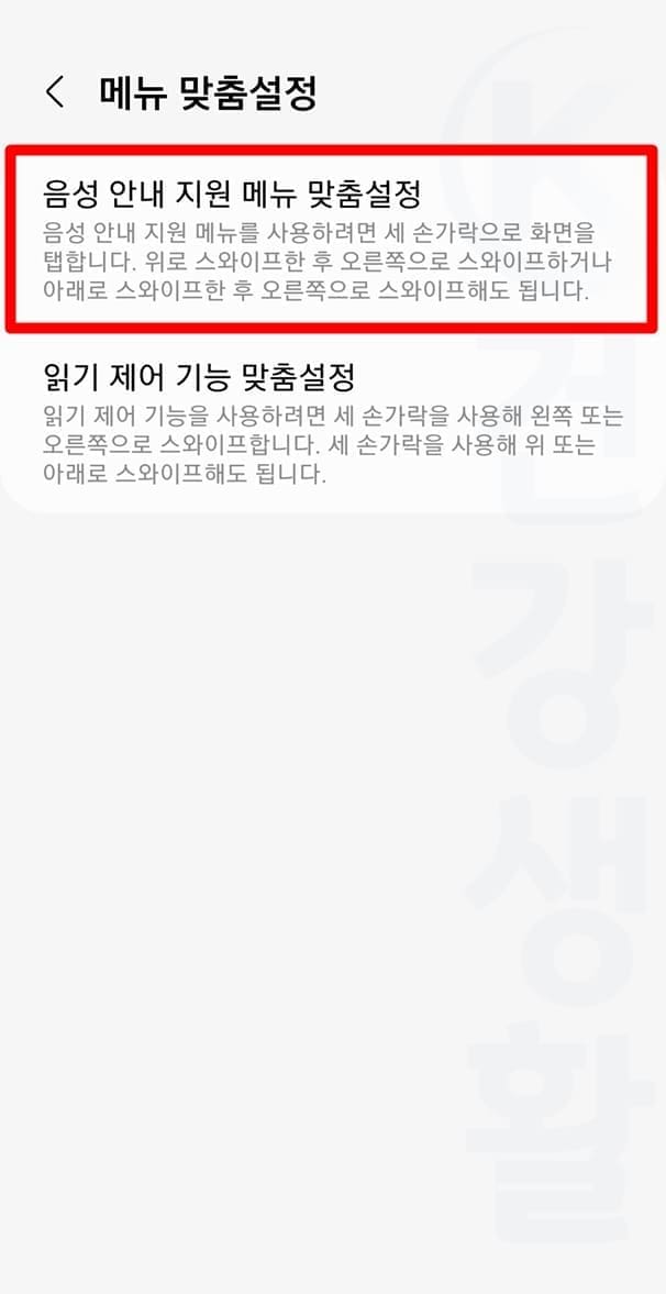 토크백 화면 > 설정 > 메뉴 맞춤설정을 클릭해주세요.이 후 음성 안내 지원 메뉴 맞춤 설정으로 들어갑니다.