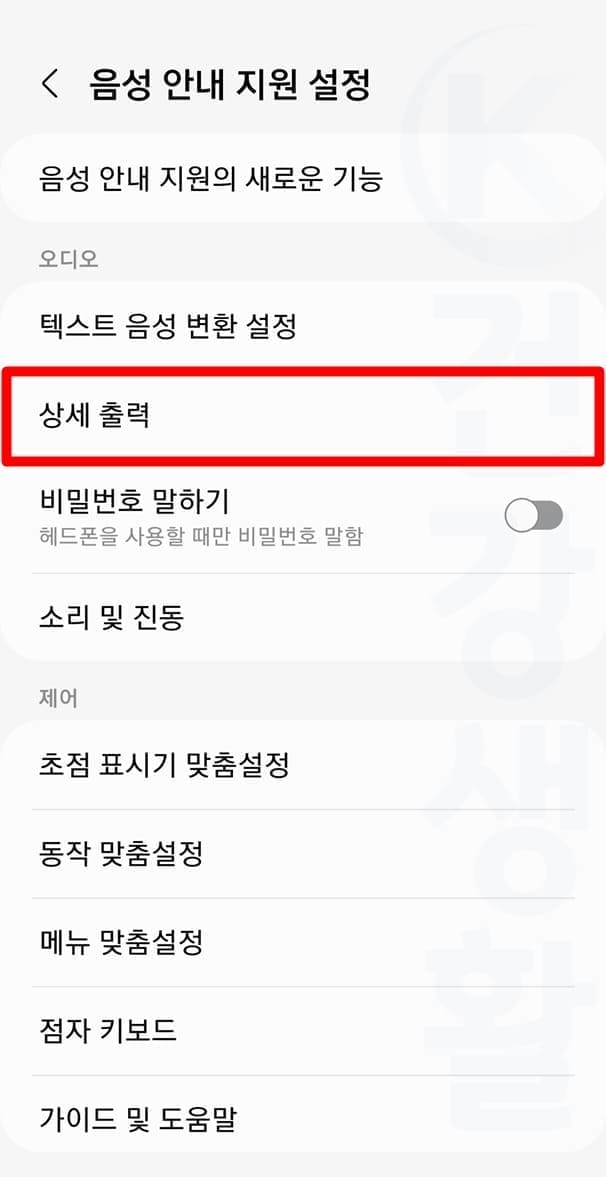 토크백 화면 > 설정 > 상세 출력을 클릭해주세요.