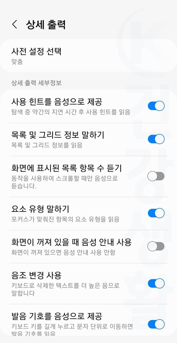 이곳에서 상세 출력 세부정보를 내 마음대로 설정할 수 있습니다. 자동 힌트를 음성으로 사용, 목록 및 그리드 정보 말하기, 화면에 표시된 목록 항목 수 듣기, 요소 유형 말하기, 화면이 꺼져 있을 때 음성 사용, 음조 변경 사용, 발음 기호를 음성으로 제공 등을 설정할 수 있는데요. 시각장애인분이라면 꼭 이용해하는 필수 설정 메뉴라고 하니 필수 설정 팁으로 포함시켰습니다.
