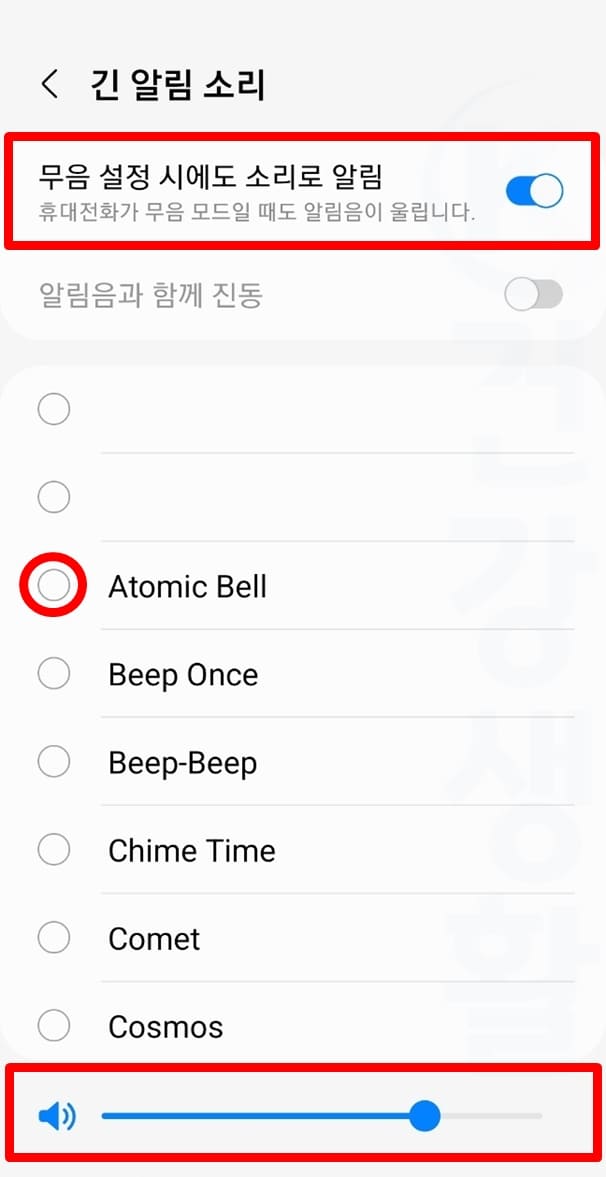 설정 화면에서 '무음 설정시에도 소리로 알림' 기능과 소리 크기 조절바 기능을 함께 조절하여 이용할 수 있습니다.
