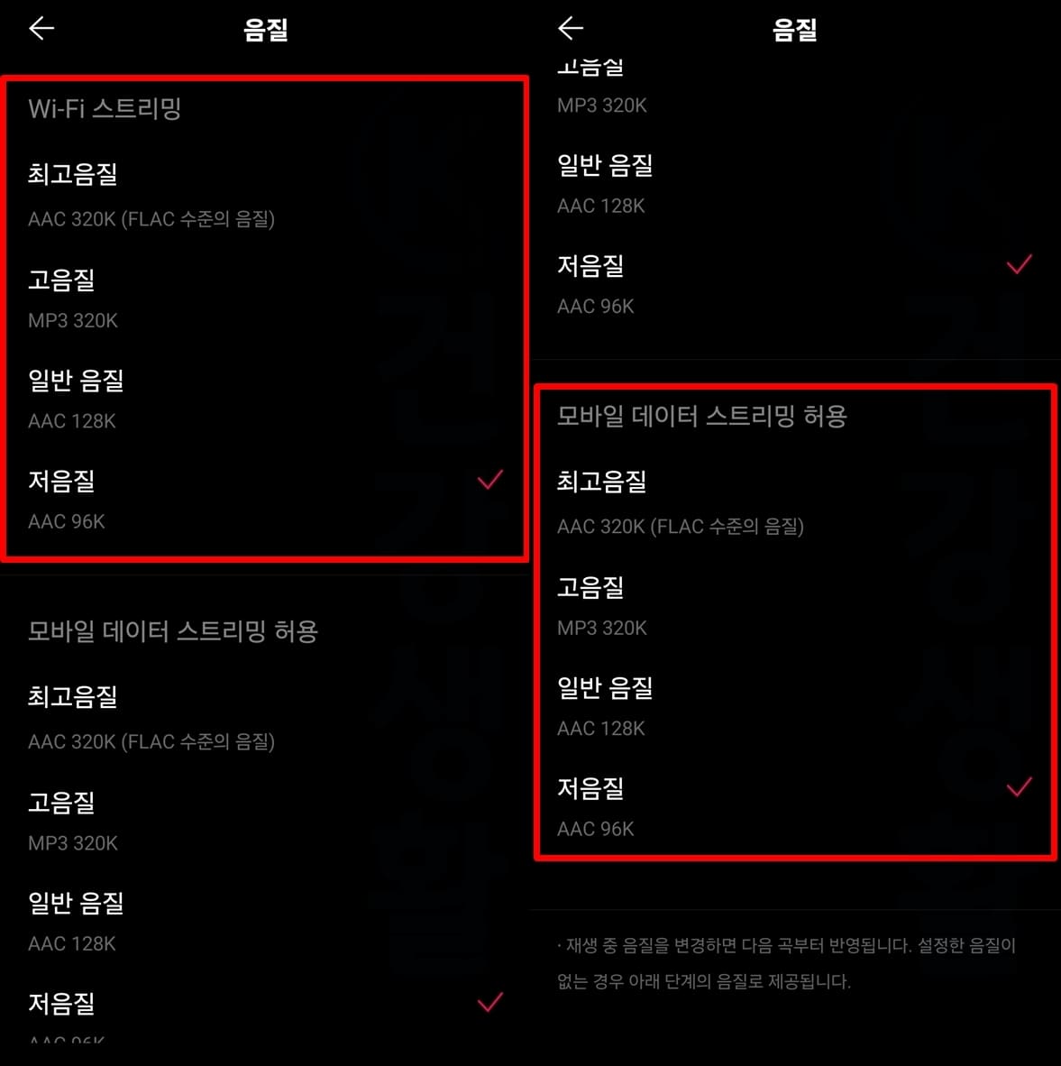 6. Wi-Fi 스트리밍 음질과 모바일 데이터 스트리밍 음질을 설정할 수 있습니다.
